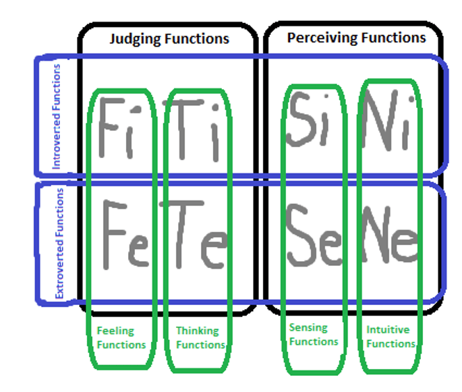 Two of the perceiving functions are sensing and two of the perceiving functions are intuitive, while two of the judging functions are thinking and two of the judging functions are feeling.